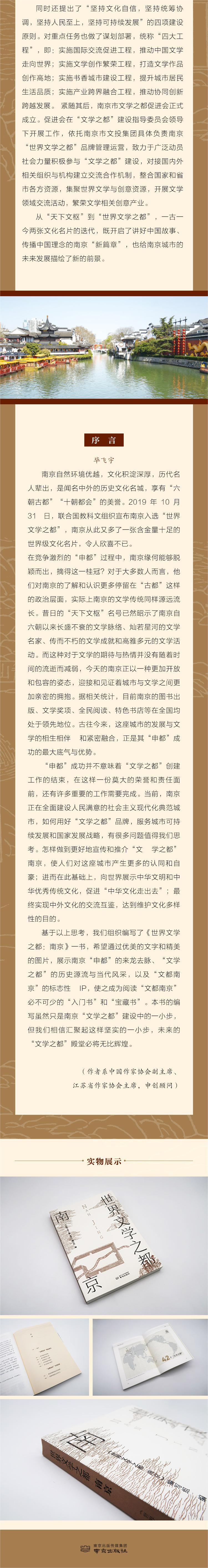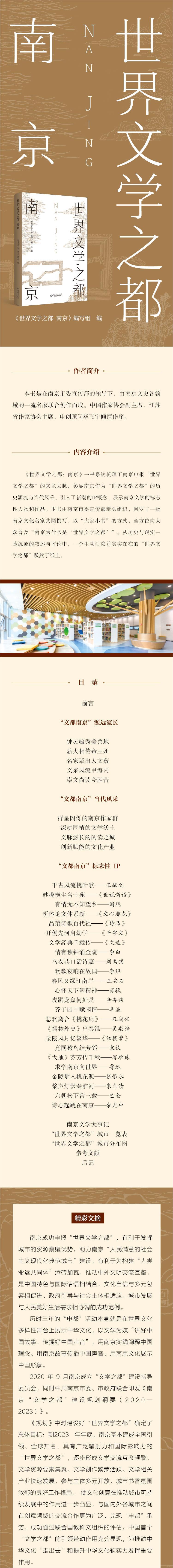 2019年10月31日,南京一举跻身联合国教科文组织创 意城市网络“文学之都”行列,本书将围绕这一主题,将 文学作品、人物以及特有的文学现象,置于地域环境与时 代语境的大背景下去叙述。以深入浅出的方式介绍“世界 文学之都”的概念,讲述南京申都的困难与挑战、积累与 探索、诚意与决心、意义与愿景,全面梳理文都南京的历 史源流,展现文都南京的当代风采,提炼文都南京的若干 标志性IP,以多重视角揭示文学之都的历史印记,呈现南 京的 韵味,彰显珠玉之辉,以不负时代所赋予我们这 座城市 的荣光,提升古都南京的伟岸形象。